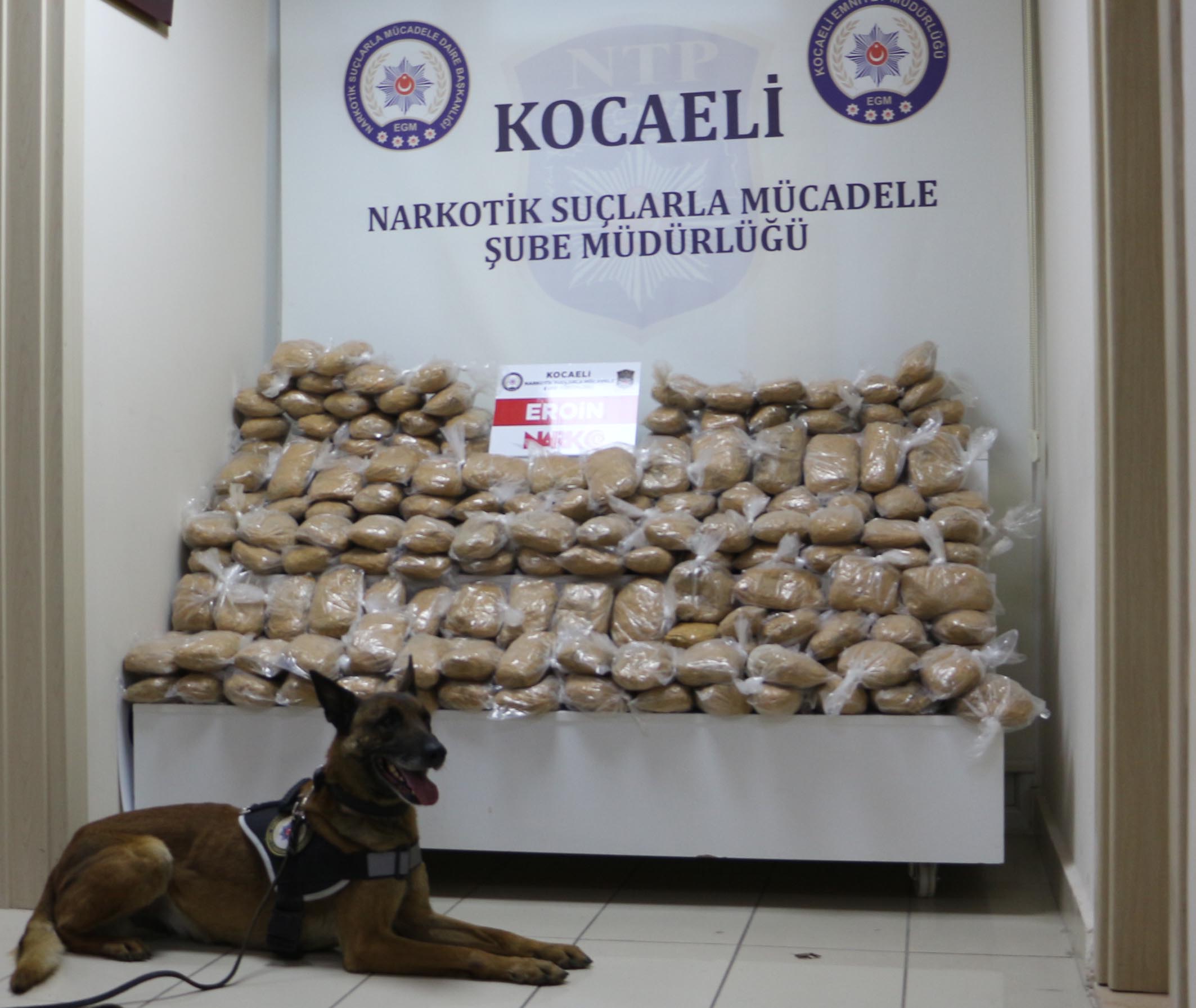 Kocaeli’nde polisin durdurduğu bir minibüste narkotik köpeği 'Millow' ile yapılan aramada, kaplamaların altına, stepneye ve ses sistemine gizlenen 111 kilo eroin ele geçirildi. Minibüsteki baba ile 2 oğlu gözaltına alındı.