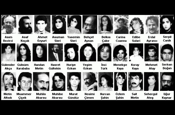 Muhlis Akarsu- 45 yaşında, sanatçı Muhibe Akarsu - 45 yaşında, Muhlis Akarsu'nun eşi Gülender Akça - 25 yaşında Mehmet Atay - 25 yaşında, gazeteci, fotoğraf sanatçısı Sehergül Ateş - 30 yaşında Behçet Sefa Aysan- 44 yaşında, şair Erdal Ayrancı - 35 yaşında Asım Bezirci- 66 yaşında araştırmacı, yazar Belkıs Çakır- 18 yaşında Serpil Canik - 19 yaşında Muammer Çiçek - 26 yaşında, aktör Nesimi Çimen- 62 yaşında, şair, sanatçı Serkan Doğan - 19 yaşında Hasret Gültekin- 22 yaşında şair, sanatçı Murat Gündüz - 22 yaşında Gülsüm Karababa -22 yaşında Uğur Kaynar- 37 yaşında, şair Emin Buğdaycı-18 yaşında şair Asaf Koçak- 35 yaşında, karikatürist Koray Kaya - 12 yaşında Menekşe Kaya - 15 yaşında Handan Metin - 20 yaşında Sait Metin - 23 yaşında Huriye Özkan - 22 yaşında Yeşim Özkan - 20 yaşında Metin Altıok - 53 yaşında, şair, yazar, felsefeci Carina Cuanna Thuijs - 23 yaşında, Hollandalı gazeteci Ahmet Özyurt - 21 yaşında Nurcan Şahin - 18 yaşında Özlem Şahin - 17 yaşında Asuman Sivri - 16 yaşında Yasemin Sivri - 19 yaşında Edibe Sulari- 40 yaşında, sanatçı İnci Türk - 22 yaşında, OTEL ÇALIŞANLARI Kenan Yılmaz - 21 yaşında Ahmet Öztürk- 21 yaşında.