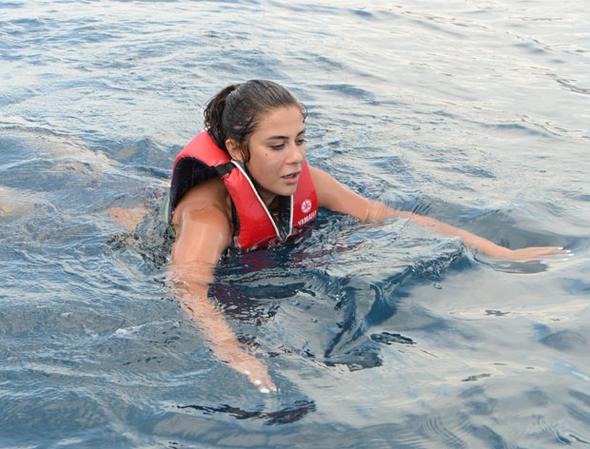 Su kayağı dersi alan oyuncu, iki-üç denemenin ardından su üzerinde ilerlemeyi başardı.