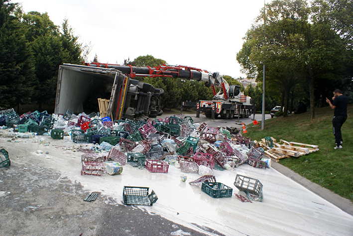 Gebze Develi Durağı altı E-5 yan yolda dün meydana gelen kaza ucuz atlatıldı. Eskihisar feribot istikametinden gelip E-5 İstanbul istikametine dönmek isteyen 26 VR 240 plakalı TIR sürücüsü, kavşak dönüşünde önüne başka bir aracın çıkması sonucu devrildi. Kaza sonrası araçta bulunan ayran, yoğurt ve kaşar peyniri başta olmak üzere tonlarca süt ürünleri malzemesi yola saçıldı.