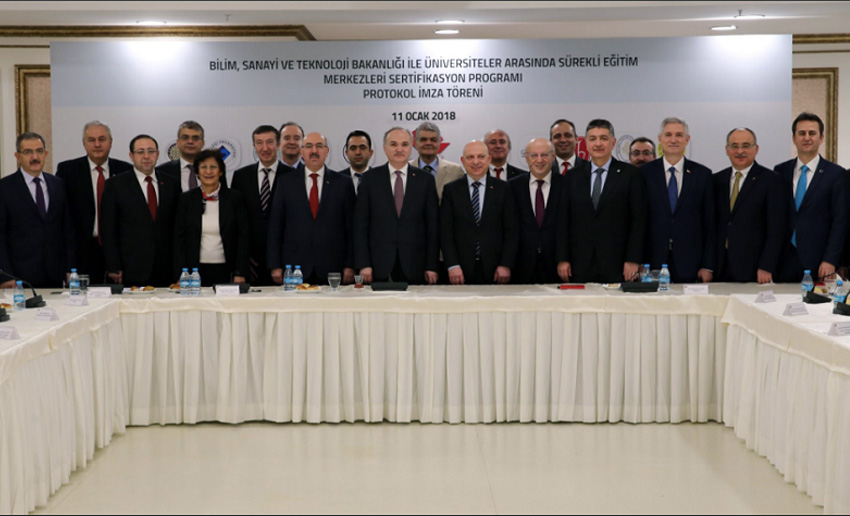 Türkiye’nin sanayi 4.0’ın etkisi ile tüm dünyada hızlanan teknoloji yarışında geride kalmaması ve bu yarışta öncü ülkelerden biri olması için Bilim, Sanayi ve Teknoloji Bakanlığı tarafından yüksek teknolojili ürünler geliştirmek için insan kaynağını yetiştirmek üzere üniversitelerle protokol imzalandı. Bakanlıkta düzenlenen protokol imza törenine Bilim, Sanayi ve Teknoloji Bakanı Faruk Özlü, GTÜ Rektörü Prof. Dr. Haluk Görgün, üniversite rektörleri katıldı. Sürekli Eğitim Merkezileri Sertifikasyon Programının ilk etapta Yüksek Öğretim Kurumu (YÖK) tarafından açıklanan 10 araştırma üniversitesi ile 5 aday üniversitenin bünyesindeki Sürekli Eğitim Merkezlerinde verilmesi kararlaştırıldı.