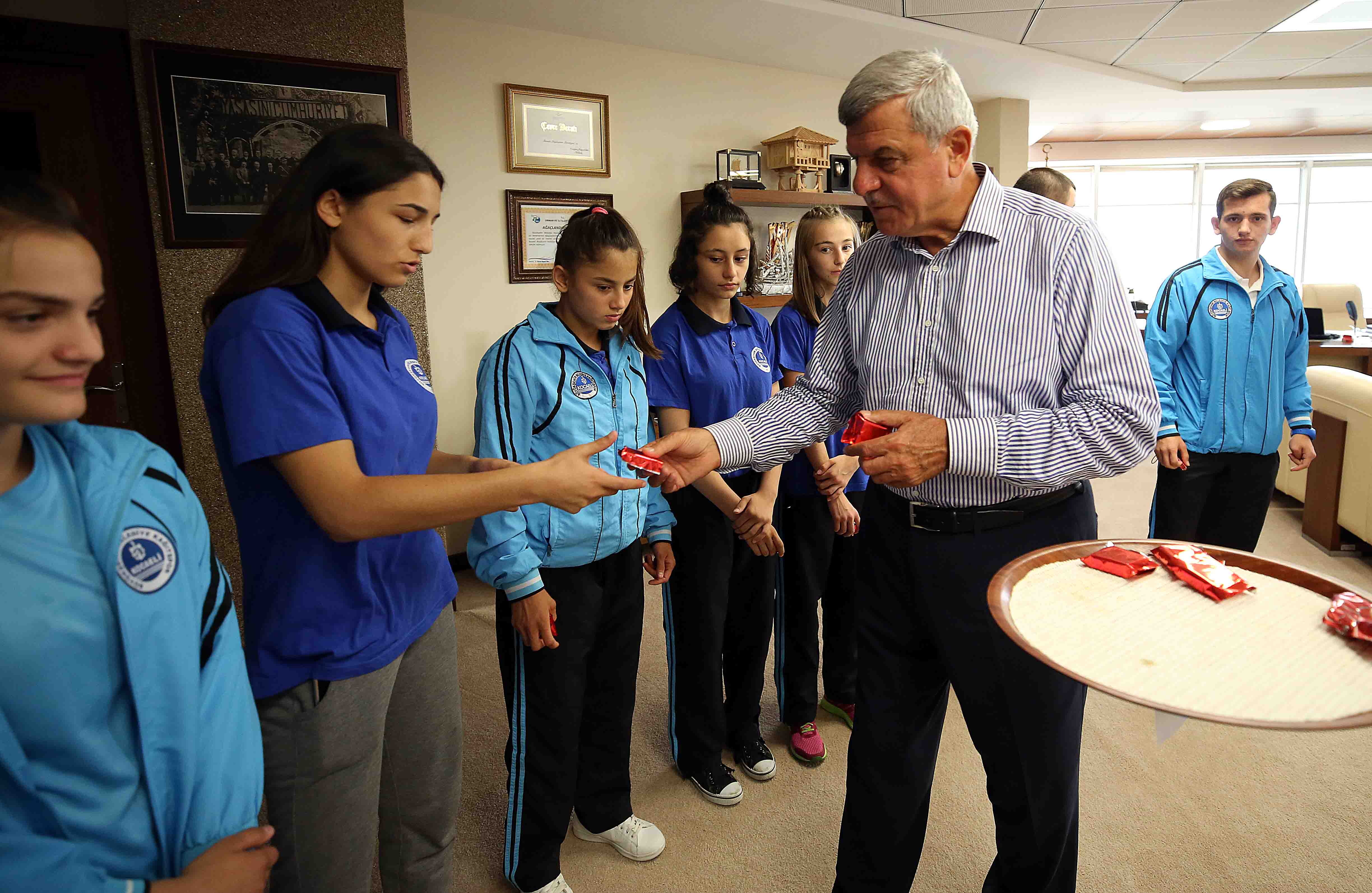 Türk Dünyası Belediyeler Birliği (TDBB) ve Kocaeli Büyükşehir Belediye Başkanı İbrahim Karaosmanoğlu, yurt içi ve dışı şampiyonalarda derece yapan Büyükşehir Kağıtspor’lu sporcuları makamında ağırladı. Yakaladıkları başarılardan dolayı sporcuları bir kez daha tebrik eden Karaosmanoğlu, “Ülkemizin ve kentimizin gururusunuz. Sizlerin yakaladığı başarılarla mutlu oluyoruz” dedi. Kağıtspor Kulüp Başkanı ve Büyükşehir Belediyesi Genel Sekreter Yardımcısı Dr.Ali Yeşildal’ın hazır bulunduğu ziyarette, Başkan Karaosmanoğlu sporculara başarılarından dolayı hediye takdim etti.