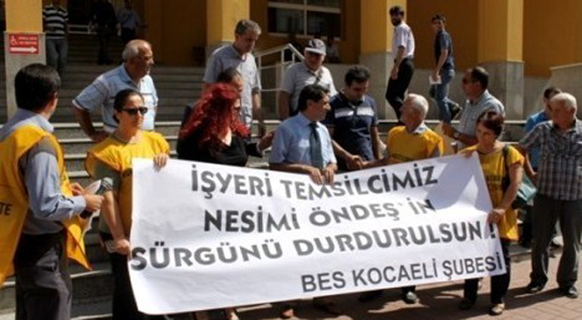 Gezi Parkı eylemlerinden sonra Kocaeli’deki örgütlü oldukları işyerlerinde idari soruşturmalar başlatıldığını söyleyen Şişman, “AKP’nin baskıcı, dayatmacı ve otoriter politikalarına karşı Haziran’da 3 gün grev yaptık. Bu grevlerin ardından işyeri temsilcilerimizden Nesimi Öndeş’in de içinde bulunduğu 41 büro emekçisine idari soruşturma açıldı” dedi. Derince’de ikamet eden Nesimi Öndeş’in keyfi ve hukuksuz bir şekilde Kandıra’ya sürgün edilerek cezalandırıldığını söyleyen Şişman, “Kanun gereği, çalışanların görev yerleri keyfi tutumlarla değiştirilemez. Bu hukuksuzluğun sebebini merak ediyoruz. Üstelik bu keyfi atama, adalet dağıtması gereken Adalet Bakanlığı’nda oluyor. Bu nasıl iş?” diye konuştu.