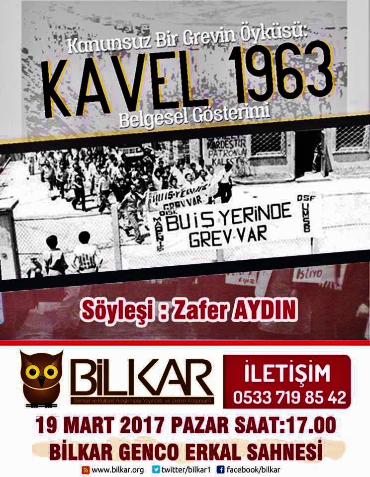 Pazar günü 17.00’da BİLKAR Genco Erkal Sahnesinde gerçekleşecek etkinlikte Sendikacı – yazar Zafer Aydın ile sinema yönetmeni Melih Biçer'in hazırladığı, kurgusunu Cihangir Köse, müziklerini Erdal Güney, görüntü yönetmenliğini Sinan Güngör’ün yaptığı, Tülin Özen ve Serkan Şen tarafından seslendirilen “Çoban ateşlerinin yandığı yerde, Kavel'de” belgeselinin gösterimi yapılacak. Belgesel gösterimin ardından “'Kanunsuz' Bir Grevin Öyküsü Kavel” kitabının da yazarı olan sendikacı – yazar Zafer Aydın’la söyleşi gerçekleştirilecek.