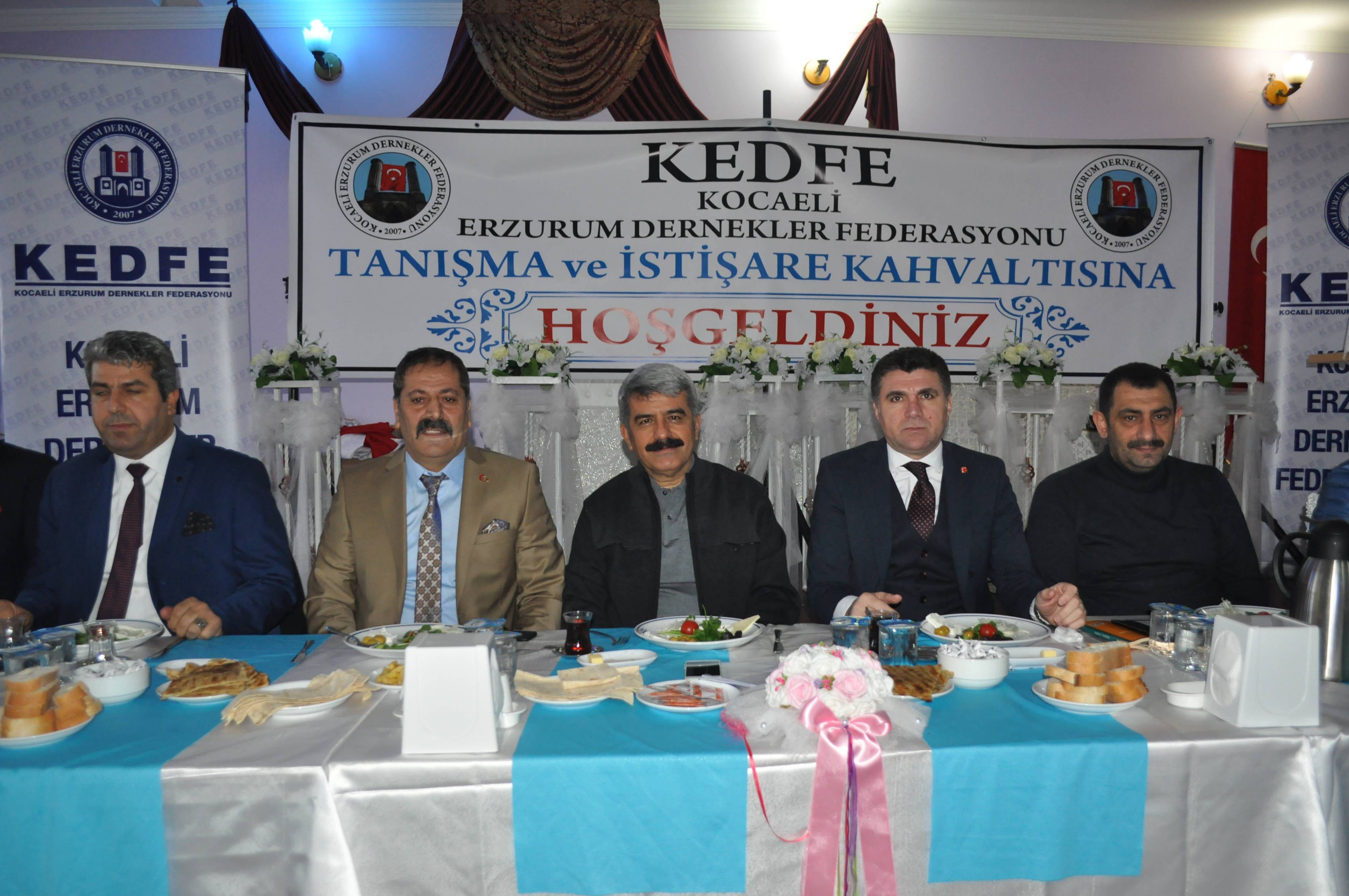 Ses getiren projeleri ve örnek oluşumuyla ilimizin aktif ve başarılı kuruluşlarının başında gelen Kocaeli Erzurum Dernekler Federasyonu(KEDFE), bugün gerçekleştirdiği istişare kahvaltısında hemşehrilerini kucakladı. Körfez Öğretmenevi’ne sığmayan Dadaşlar’ın görülmeye değer coşkusu büyük taktir topladı. KEDFE’nin Körfez Öğretmenevi’nde gerçekleşen istişare kahvaltısına; Kocaeli Üniversitesi Rektörü Prof.Dr.Sadettin Hülagü, Kocaeli Valisi Özel Kalem Müdürü Erhan Dündar, Başiskele Belediye Başkan Yardımcısı Köksal Ayabakan, Kocaeli İl Spor Müdürü Muzaffer Cintimar, Ak Parti Kocaeli il yöneticisi Ayhan Naci Yılmaz, Kocaeli Erzurum Dernekler Federasyonu(KEDFE) Başkanı Tekin Dursun, KEDFE Kurucu Başkanı Gencay Yıldıztekin, OLFED Başkanı Murat Güzel, KEDFE 2.dönem başkanı Muhammet Şık, eski Gebze Belediye Başkanı Mehmet Emin Akın, Karabük Üniversitesi öğretim üyesi Prof.Dr.Bahattin Türetken, sivil toplum kuruluşlarının önde gelen temsilcileri, ilçe ve köy dernek başkanları ve yöneticileri ile KEDFE gençlik ve kadın kolları yönetimi katıldı.