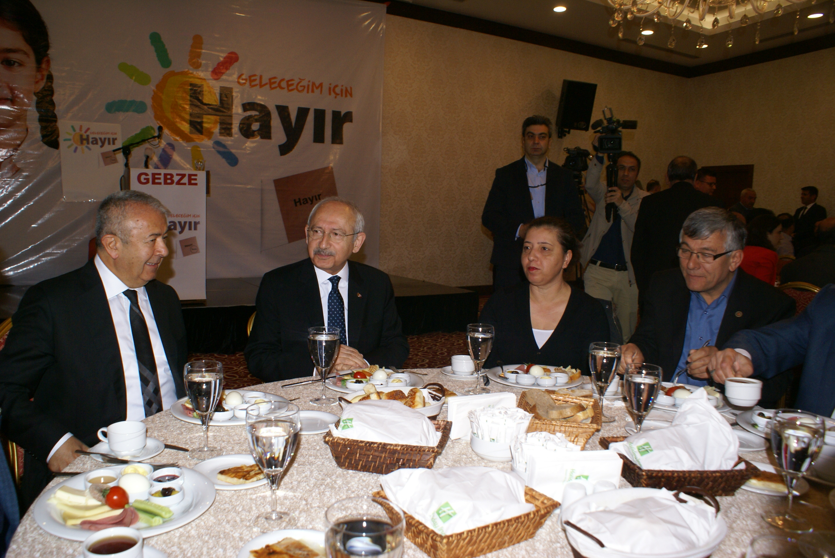 Gebze Holiday INN Otel’de düzenlenen programa; CHP Kocaeli Milletvekilleri Fatma Kaplan Hürriyet, Haydar Akar, Tahsin Tarhan, Genel Başkan Danışmanı Erdoğan Toprak, il başkanı Cengiz Sarıbay, il kadın kolları başkanı Sevim Korkmaz Pekyörür, il gençlik kolları başkanı Murat Erinç, ilçe başkanları, Gebze, Darıca, Çayırova ve Dilovası’ndaki mahalle muhtarları katıldı. Muhtarlar ve partililerle birlikte kahvaltı yapan Kılıçdaroğlu, Gebze Muhtarlar Derneği Başkanı Necati Özyurt ile bayan muhtar Yavuzselim Mahalle Muhtarı Şükriye Kavran, Beylikbağı Mahalle Muhtarı Cafer Demirkan, Mimarsinan Mahalle Muhtarı Necati Kütük ile yan yana oturarak onlarla sohbet etti.