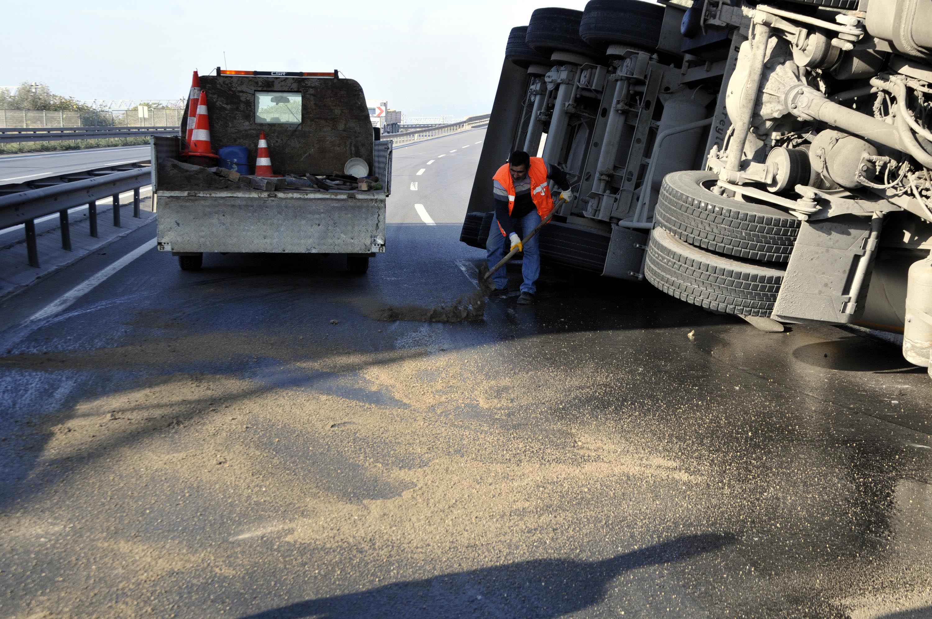 KOCAELİ'nin Körfez ilçesinde, asfalt yüklü tankerin devrilmesi sonucu 15 ton asfalt yola aktı. Kaza nedeniyle D-100'de uzun araç kuyrukları oluşurken, Çevre İl Müdürlüğü ekipleri de asfaltın yağmur kanallarından denize gitmesini engellemek amacıyla mazgal önlerine toprak döktü.