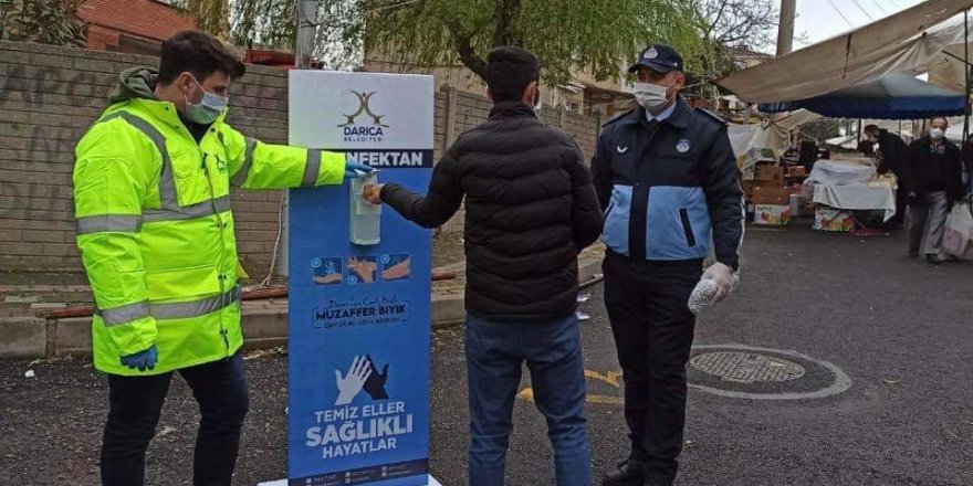 Darıca Belediyesi Pazar ve marketlere maskesiz girilmemesi için denetimleri sıklaştırdı. Pazar girişlerine ayrıca dezenfektan konuldu.