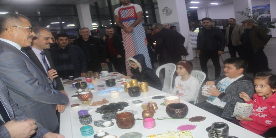 Necmettin Erbakan Kültür Merkezi’ndeki etkinlikte, gösteri salonunun fuayesinde sergilenen biblolara imzasını öğrenciler Nurdan Cömert, Berat Yavuz ve Hazal Tektaş attı. Öğretmenleri Ceyhun Çimen ve Emine Abay çalışmayı şöyle izah etti: “Çok kısa süreli çalışma oldu bizim için. 1.5 haftada çıkan ürünlerimiz bunlar. Taş tozundan kalıplarımız var, kalıplara döküyoruz. Ham objeler ortaya çıkartıyor ve çocuklarımızla birlikte boyuyoruz.”