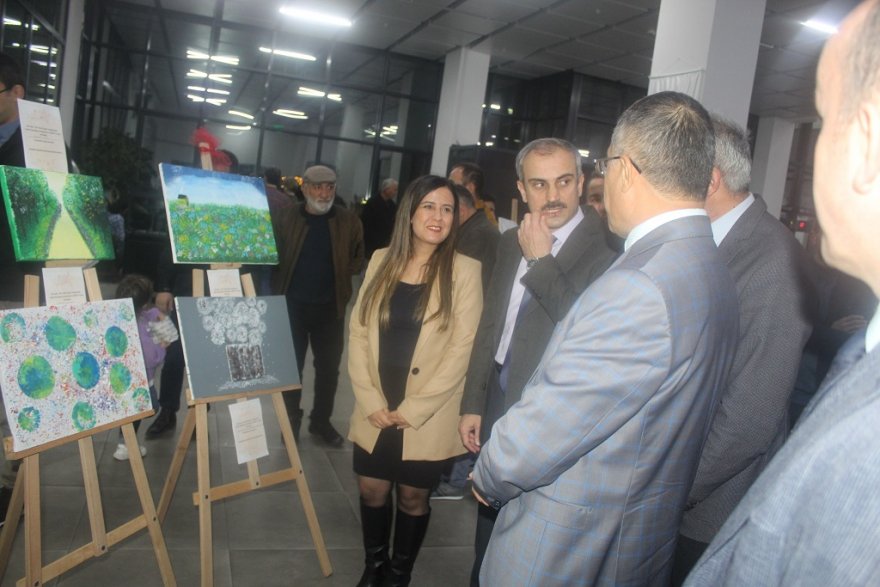 Çayırova Kaymakamı Ahmet Önal ve beraberindekiler resim sergisindeki eserlere dair öğretmen Songül Kurt Komaç’tan bilgi edindi.