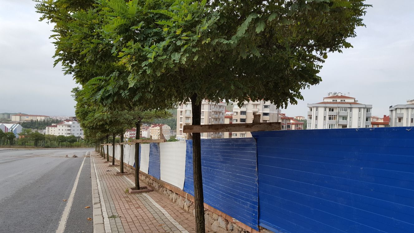 Yenikent Mahallesi Dicle Caddesi üzeri Cengiz Aytmatov parkının bitişiğindeki özel bir inşaat firmasının fidanlara çivi çakarak inşaat alanı çevresine...