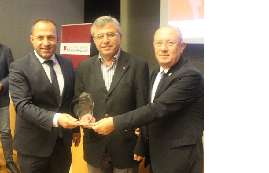 İnşaat Mühendisi Temel Pirli’ye etkinlik bitiminde onurluğu TÜRKONFED Yönetim Kurulu Üyesi Fahri Örengül ve DOĞUMARSİFED Yönetim Kurulu Başkanı Atalay Kaya tarafından verildi.