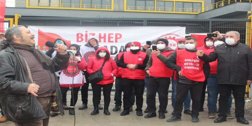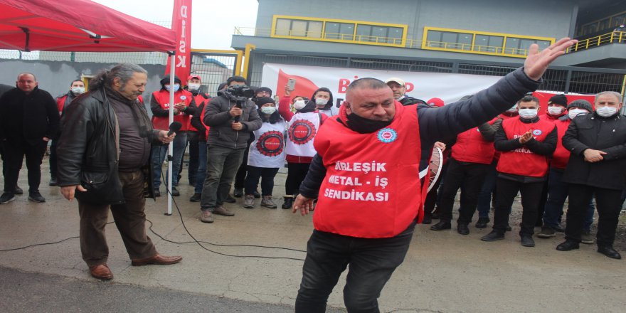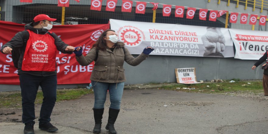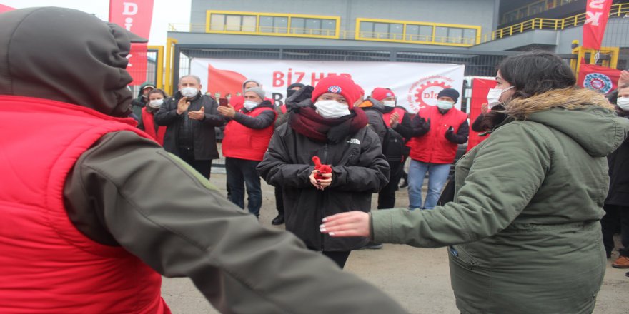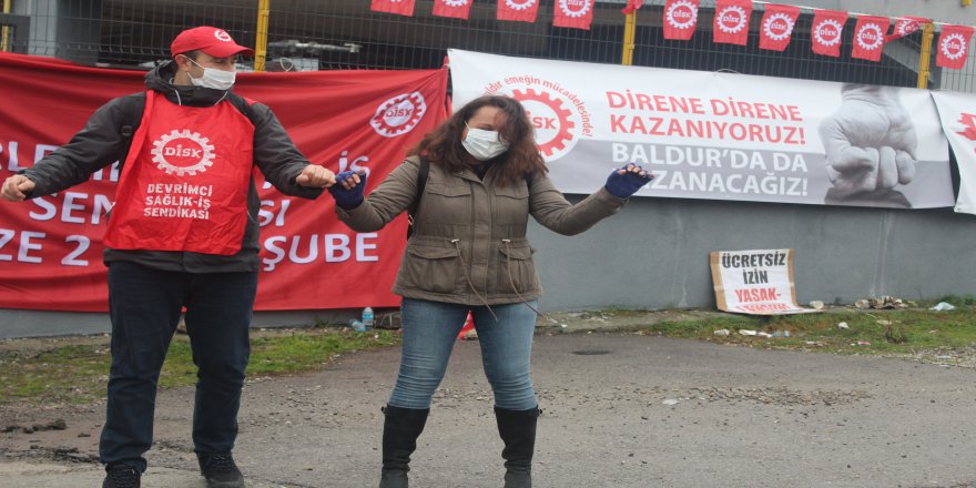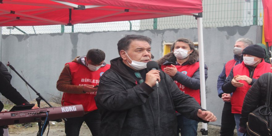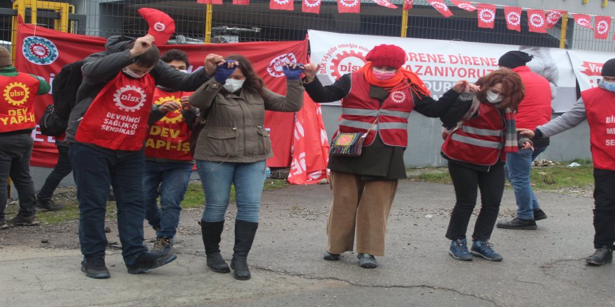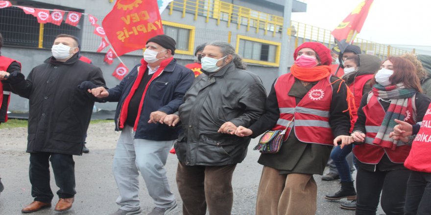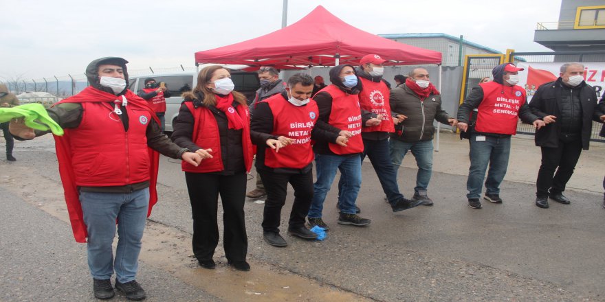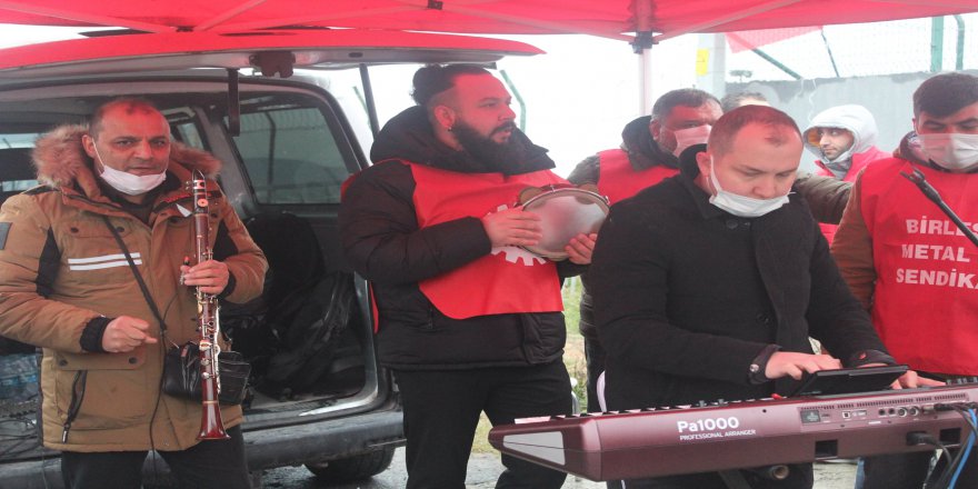 DİSK’in Baldur Süspansiyon grev alanındaki 54’ncü kuruluş yıldönümü etkinliği müzikle başladı, konuşmalarından ardından yine müzik ve halayla tamamlandı.