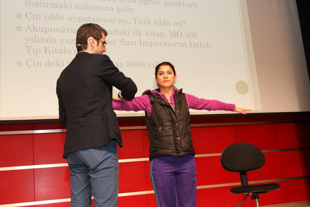 Dr. M. Mustafa Çiftçi akupunktur tedavi yönetimini izleyicilerden birini sahneye alarak uygulamalı bir şekilde anlattı. Çiftçi, “ Akupunktur en az 3000 yıllık bir geçmişi olan bir tedavi yöntemi. Doğadaki her şey zıtlıklar üzerine kuruludur. Gece varsa gündüz de vardır, karanlık varsa aydınlık ta vardır. Bedenimizde de Yin ve Yang dediğimiz bir denge vardır. Bu denge bozulduğu zaman hastalıklar ortaya çıkıyor. İnsan vücudunda 12 kanal vardır ve Akupunktur yönteminde bu kanallara iğneler batırılır. Yani batırılan iğneler rast gele değildir ve her kanalın her iğnenin bir anlamı vardır” ifadelerine yer verdi.