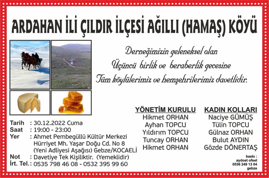 Ardahan İli Çıldır İlçe Ağıllı (Hamaş) Köyü Derneği tarafından 30 Ocak Cuma akşamı birlik ve dayanışma gecesi gerçekleştirilecek.