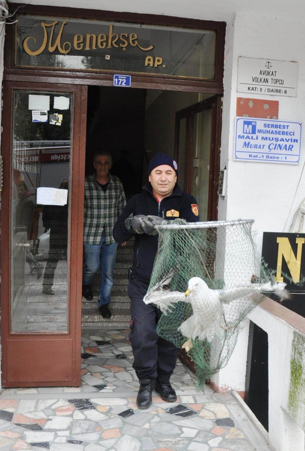 İzmit’te, bir apartmanın havalandırma boşluğuna girerek mahsur kalan martı, itfaiye ekiplerince kurtarıldı.