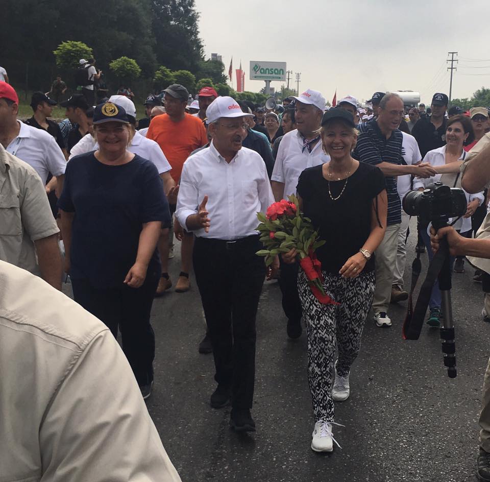 Ankara'dan İstanbul'a başlattığı 'Adalet Yürüyüşü ‘nü sürdüren CHP Genel Başkanı Kemal Kılıçdaroğlu'na 19'uncu günde, gazeteciler, yazarlar ve çeşitli sivil toplum örgütleri temsilcileri de eşlik etti. Hürriyet Gazetesi yazarı Ayşe Arman, gazeteci- yazar Levent Gültekin ve Atatürkçü Düşünce Derneği Genel Başkanı Tansel Çölaşan da Kılıçdaroğlu ile birlikte yürüdü. Kılıçdaroğlu, yürüyüşte Kocaeli'nin Kartepe İlçesi'nde, İstanbul'a 100 İzmit'e 12 kilometre kaldığını gösteren tabelanın yanından geçti. Yürüyüşe katılan birçok kişi, bu tabelanın önünde fotoğraf çektirdi.