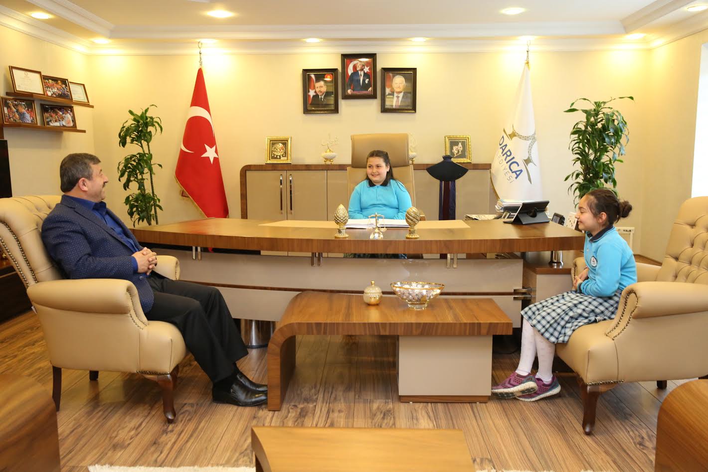 23 Nisan Ulusal Egemenlik ve Çocuk Bayramı etkinlikleri kapsamında, Darıca Belediye Başkanı Şükrü Karabacak, başkanlık koltuğunu bir süreliğine minik öğrencilere devretti. Ahmet Parmaksızoğlu İlköğretim Okulu Müdürü Feyyaz Demirbaş ve öğretmenler eşliğinde Başkan Karabacak’ı ziyaret eden minik öğrencileri makamında ağırlayan başkan Karabacak, başkanlık koltuğuna 4. Sınıf öğrencisi Adile Binali’ye devretti. Başkanlık koltuğuna oturan Adile Binali İlçede yaşayan çocuklar adına ilçeye kazandırdığı hizmetlerden dolayı Başkan Karabacak’a teşekkür etti.