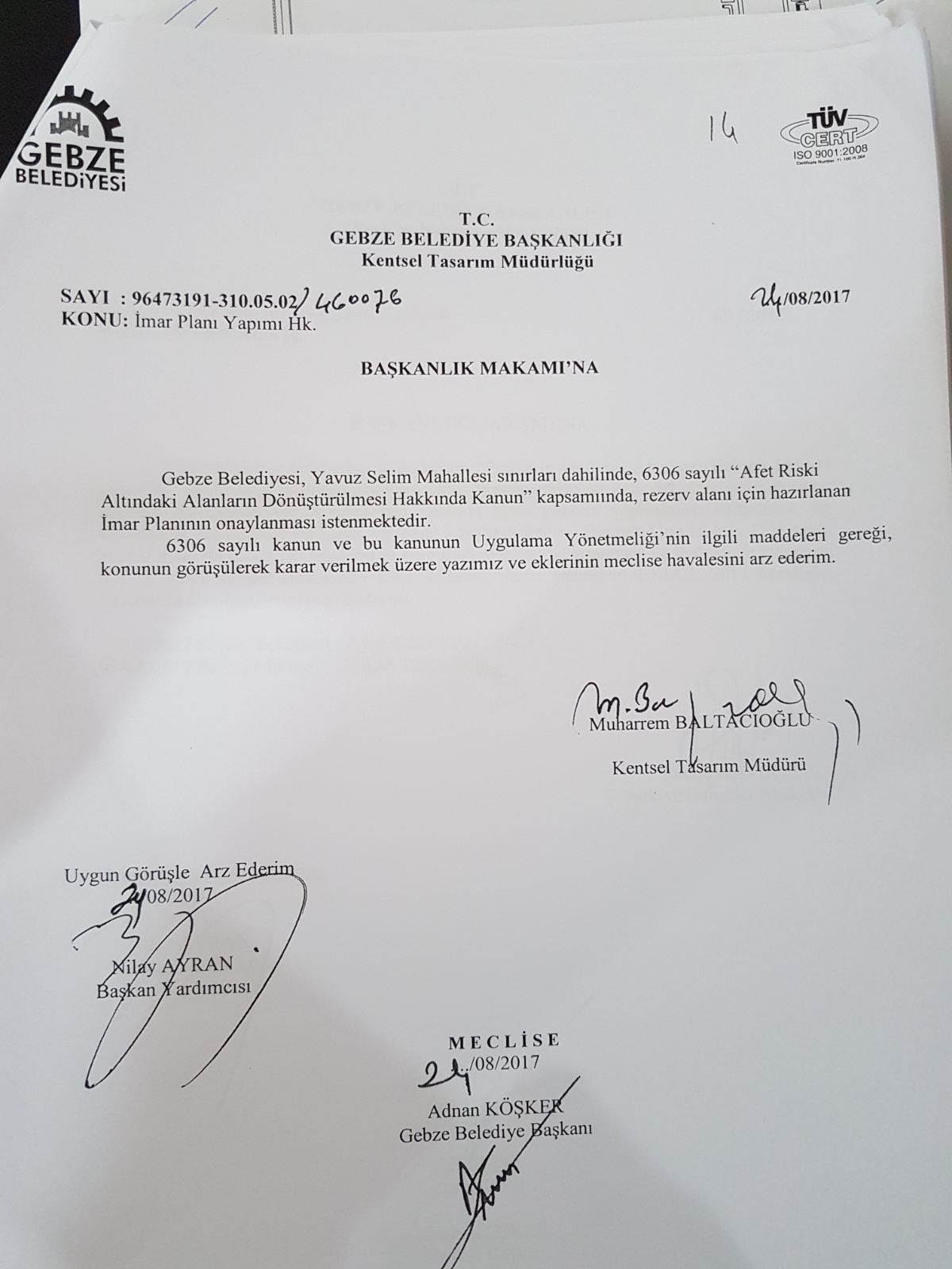 CHP Gebze İlçe Başkanı Recep Dursun, önceki akşam Yavuzselim ve Hürriyet Mahallesi dernek başkanları ve yöneticileri ile bir araya geldi. Her iki mahallede de kentsel dönüşüm m yapılmayacağını ifade eden Dursun; “Gebze Belediyesinin beceriksizliği yüzünden konuya bakanlık el attı ve şimdi kendisi yapmak istiyor. Ayrıca her iki mahallede de kentsel dönüşüm yapılmayacak. Zira bu mahalleler afet riskli bölgeler olarak gösteriliyor. Bu şekilde devam ederse çok insan mağdur olacak. Vatandaşın tapusunu verin, vatandaş ne istiyorsa onu yapsın. Ayrıca bu şekilde kat artırımına gidilir ve belediye de buradan kazançlı çıkabilir” dedi. Konunun ekim ayı başında belediye meclisinde görüşüleceğini de ifade eden CHP Gebze İlçe Başkanı Recep Dursun, Gebze’deki tüm diğer siyasi parti ilçe başkanlarının da bu meclisi izlemelerini istedi. Mahalle sakinleri ise 40-50 yıldır buralarda ikamet etmelerine rağmen bölgenin afet riskli bölge olarak anılmasına tepki gösterdiler.