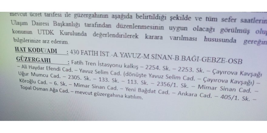 “Bugün (02 Şubat) 430 no’lu ulaşım hattının İnönü Mahallesi’nden alındığını biliyor musunuz? O hat Mahzuni Şerif Parkı’nın oradan vatandaşların Gebze’ye ulaşımını sağlıyordu. Var olan ulaşım alındı Sayın Başkan, belki haberiniz yok. Ben sizi bu konuda da bilgilendireyim.”