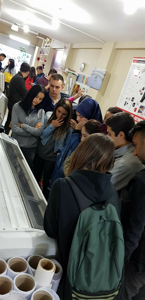 Okul öğretmenlerinden Dursun Gülyeri’nin koordinatörlüğünde Kerem Copy’ı ziyaret eden öğrencilere en son teknoloji baskı makinaları, grafik ve tasarım konularından eğitimsel düzeyde bilgi verildi. Firma sahibi Ali Ozan Kaya ziyarete gelen öğrencilere dijital baskı, sublimasyon baskı, lazer markalama ve ofset baskı hakkında detaylı olarak bilgilendirdi. Öğrenciler teknolojinin ilerlemesiyle gelişen makine parkurlarını inceleyerek gerekli bilgilere sahip oldular ve bir kez daha bu bölümü seçtikleri için mutlu olduklarını ifade ettiler.
