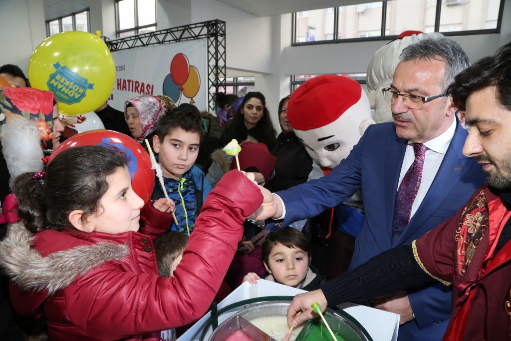 Başkan Köşker karne şenliği kapsamında çocuklarla birlikte GKM’de sahnelenen ‘Neşeli Hayvanlar’ çocuk tiyatrosunu izledi. Çocukların oldukça güzel vakit geçirdikleri tiyatro gösterisi sonrası özel ikramlarda bulunuldu. Başkan Köşker, çocuklara elleriyle patlamış mısır, pamuk şeker ve Osmanlı macunu ikram etti. Karne Şenliği 28 Ocak Pazar gününe kadar GKM’de devam edecek.