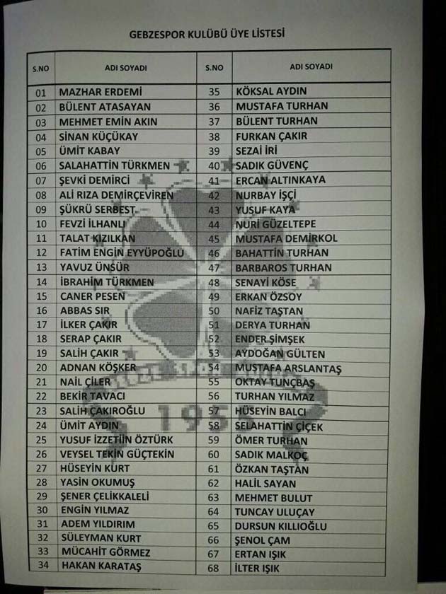 Öte yandan mevcut yönetim aidatlarını ödemedikleri gerekçesiyle üyelikten silinen ve tekrar üyeliğini yenilemek isteyenlere çağrıda bulundu. Yönetim, Gebzespor’a üye olmak isteyenlerin üyelik evraklarını kulübe getirmesini istedi. İşte oy kullanabileceklerin isim listesi;