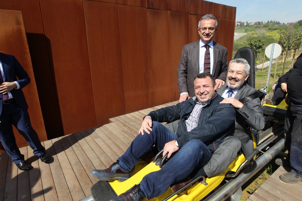 Parkı gezen meclis üyeleri, eşsiz bir manzarası olan tırmanma kulesine çıktı. Park hakkında meclis üyelerini bilgilendiren Başkan Köşker, “Sadece Gebze halkına değil tüm çevre illerden adrenalin tutkunlarını buraya çekecek bir projeye imza attık” dedi. Gebze ile beraber Türkiye’de sadece 4 yerde bulunan Dağ Kızağını test eden meclis üyeleri adrenalin ve heyecan dolu dakikalar yaşadı.