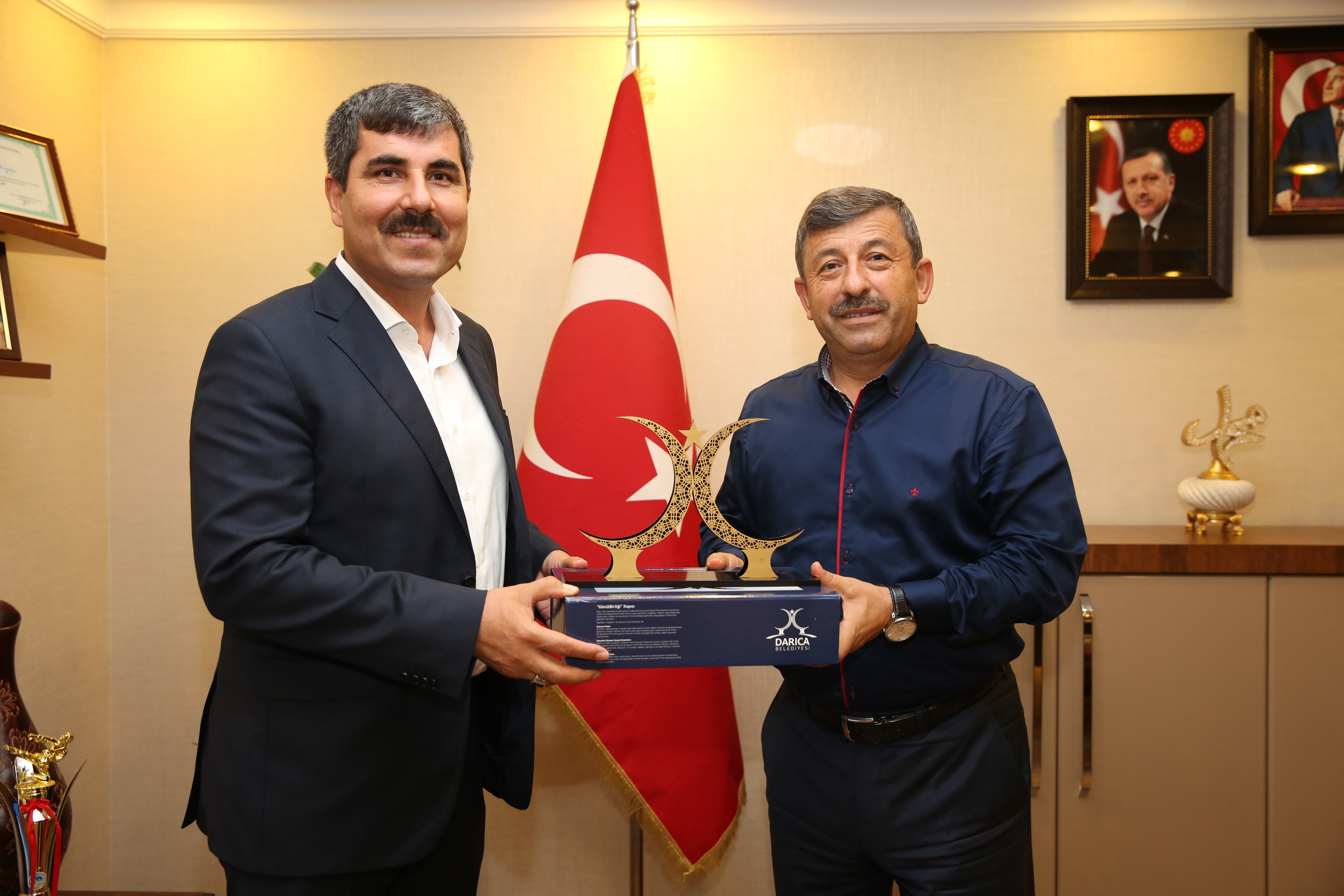 Muşlular gecesi için Darıca’ya gelen Muş Belediye Başkanı Feyat Asya, Yalova Çınarcık Kaymakamı Abdullah Çiftçi ve Yalova Çınarcık Belediye Başkanı Avni Kurt Darıca Belediye Başkanı Şükrü Karabacak’ı makamında ziyaret ederek görüş alışverişinde bulunurken, nazik ziyaretlerinden dolayı misafirlerine teşekkür eden Başkan Karabacak, Şehirler ve Kültürler Kaynaşması ile birlikte dokuz yıldır ülkenin dört bir yanından gelen misafirleri ağırlamaktan duydukları memnuniyeti dile getirdi. Başkan Karabacak, “birlik, beraberlik ve kardeşlik projesi olarak hayata geçirdiğimiz Şehirler ve Kültürler Kaynaşması sayesinde, ülkemizin bütün güzelliklerini hep birlikte yaşayarak öğreniyoruz. Doğusundan, batısına, kuzeyinden güneyine ülkemizin dört bir yanına ait, örf, adet, gelenek ve görenekleri yaşatma adına önemli bir proje olarak gördüğümüz Şehirler ve Kültürler Kaynaşmasına halkımızın da büyük ilgi göstermesi bizleri ziyadesiyle memnun ediyor. Her akşam on binlerce insan hem değişik kültürleri tanıyor, hem de ailece gönüllerinde eğleniyorlar. İnsanlarımızı mutlu görmek bizleri de mutlu ediyor.” Dedi. Başkan Karabacak daha sonra misafirleriyle birlikte Darıca sahilde gezinti yaptılar.