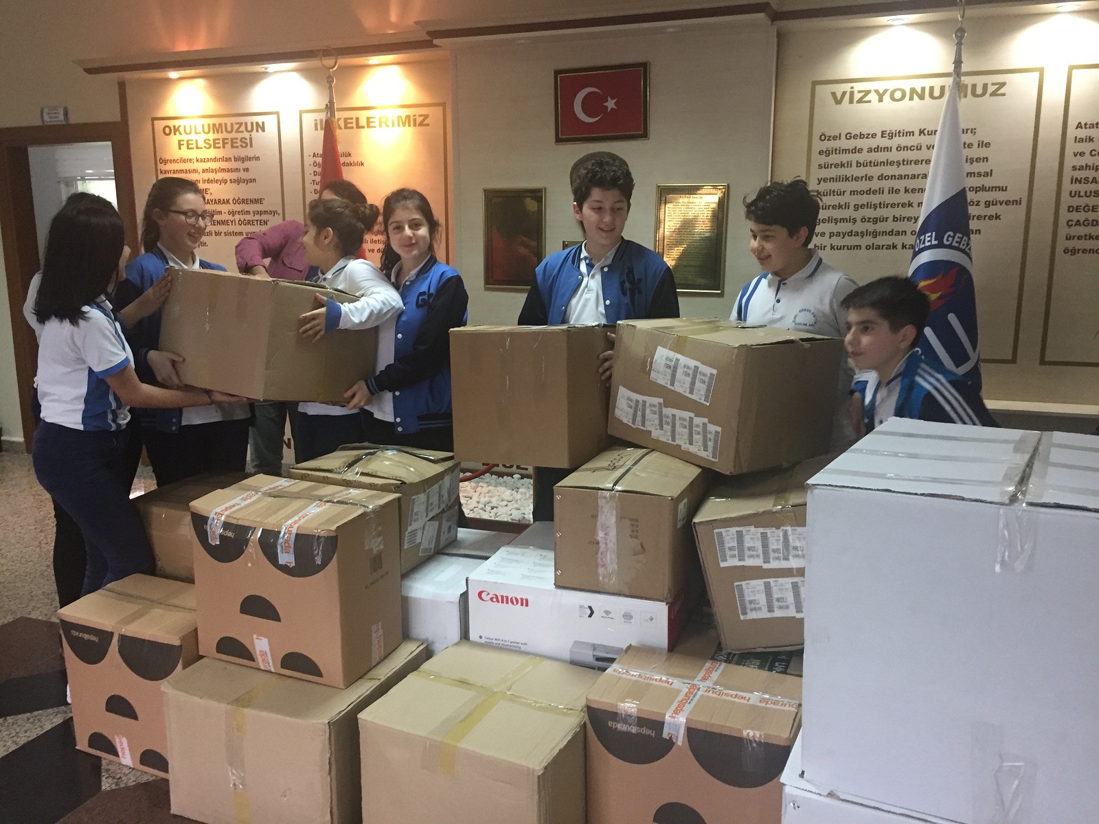 Yoğun ilgi gören yardım kampanyasında Özel Gebze Eğitim Kurumlarının öğrenci ve velilerinin almış olduğu kışlık botlar, kazaklar, montlar, çoraplar, atkılar, berelerin dışında kırtasiye malzemeleri, okul araç ve gereçleri alınarak kolilendi.