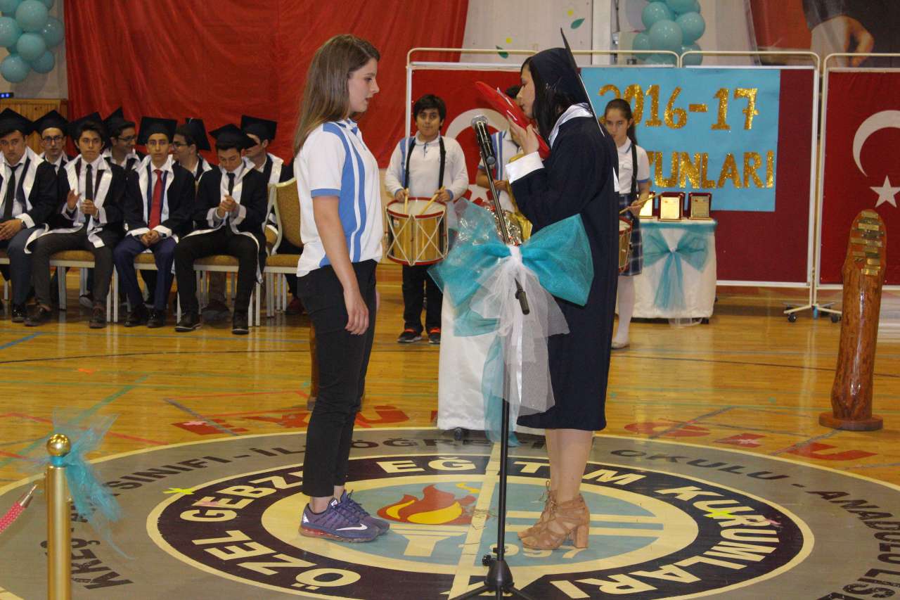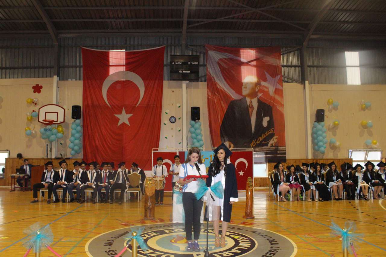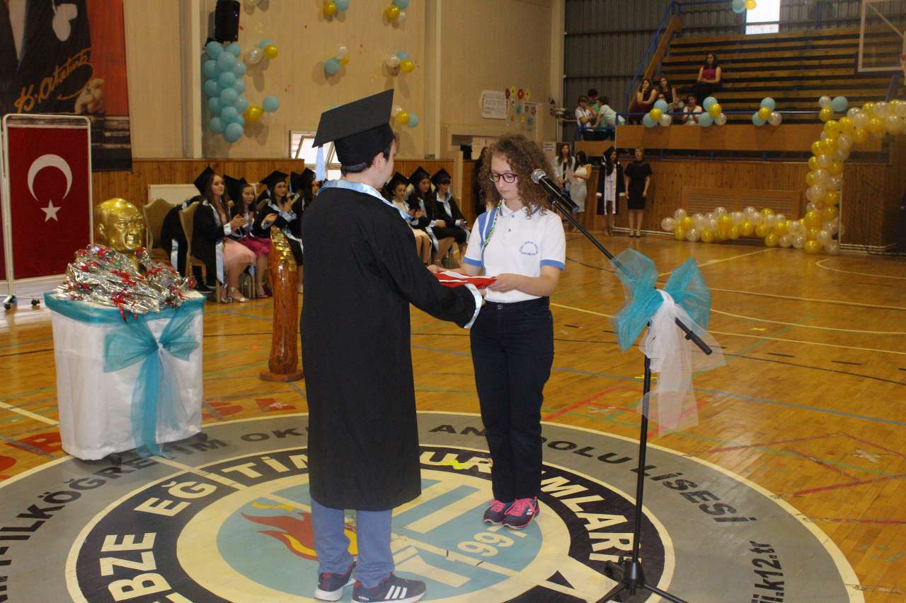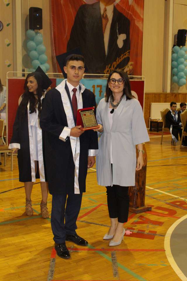 Okul birincilerinin konuşmalarının ardından plaket ve diplomalarını alan 12. Sınıf okul birincisi Arzu Karaoğlu ve 8. Sınıf okul birincisi ayrıca Türkiye TEOG 1.si Muhammed Demir geleneksel kütüğe çivi çaktılar. Okul ikincisi ve okul üçüncülerinin plaket ve diplomalarının verilmesiyle birlikte mezun olan öğrenciler diploma töreni gerçekleştirilmiş oldu. Mezun olan tüm öğrenciler adına 8. ve 12. Sınıf okul birincileri mezuniyet pastasını keserek 10. Yıl marşı eşliğinde keplerini büyük bir coşkuyla havaya fırlattılar.