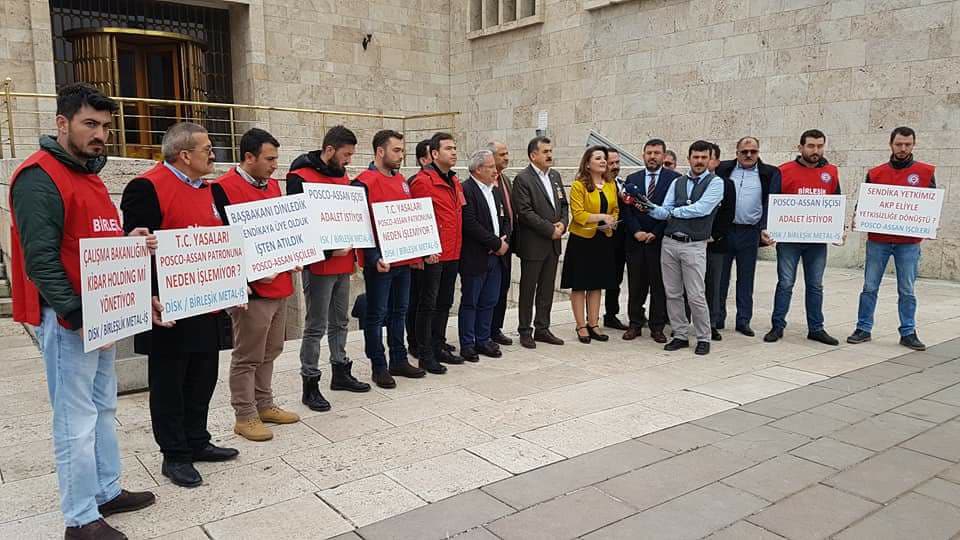 ** POSCO ASSAN işçileri ve Birleşik Metal-İş Sendikası Genel Başkanı Adnan Serdaroğlu ve sendika yöneticileriyle birlikte İşçilerin iradesinin yok sayılmasına karşı; Çalışma ve Sosyal Güvenlik Bakanlığı’nı protesto etmek için Türkiye Büyük Millet Meclisi’nde bir basın açıklaması düzenlendi.
