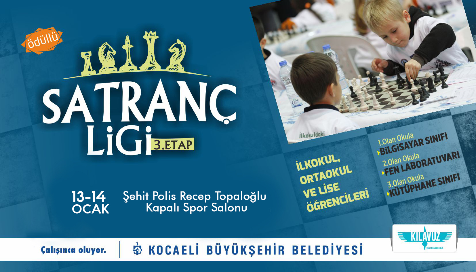 Kocaeli Büyükşehir Belediyesi Gençlik ve Spor Hizmetleri Dairesi Başkanlığı’nın, Türkiye Satranç Federasyonu işbirliğinde organize ettiği Okullar arası Satranç Ligi’nin üçüncü etabı 13-14 Ocak tarihlerinde gerçekleştirilecek. İlkokul, Ortaokul, Lise kategorisinde düzenlenen ligin üçüncü etabı İzmit Şehit Polis Recep Topaloğlu Spor Salonu’nda yapılacak. Üçüncü etap maçları 10.30’da başlayacak.