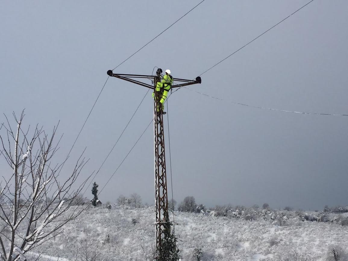 Karlı ve soğuk havada, elektrik direkleri üzerinde çevik hareketlerle şebekeye enerji vermek için mücadele eden ekipler komando eğitimi yapar gibi çalışıyorlar.