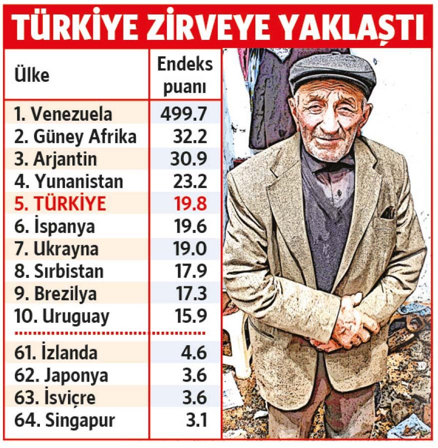 65 ülkenin yer aldığı endekste Venezuela yüzde 491.9'luk enflasyon oranı, yüzde 7.8 civarında seyreden işsizlik ile açık arayla en tepede yer aldı. Onu işsizlik + enflasyon oranı yüzde 32'yi geçen Güney Afrika ile ekonomileri batma-çıkma çizgisindeki Arjantin ve Yunanistan izledi. Türkiye ise 2017 beklentilerine göre yüzde 9 civarında enflasyon ve yüzde 10 seviyesindeki işsizlik oranıyla 5'inci oldu. Bloomberg, Türkiye'nin 2016 yılı rakamlarına göre yüzde 18.4 ile 7'nci olduğunu kaydetti.