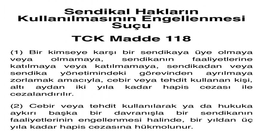 Gebze’de bazı okul müdürlerinin çalışan personele baskı yaptıkları; Darıca ve Çayırova’da da aynı şekilde bazı okul müdürlerinin bu şekilde sendikadan ayrılan ya da ayrılmak isteyenlere baskı yaptığı tespit edilen müdürler hakkında TCK’nın 118’nci maddesi gereğince savcılıklara suç duyurusunda bulunulacak ve bu konuyla ilgili İlçe Milli Eğitim Müdürleri bilgilendirilecektir.