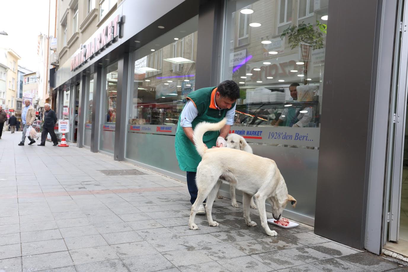 Kasaplık yapan esnafa her sabah gelen iki köpek patisiyle pencereye vurarak yemek istemesi ve karnını bu şekilde doyurması gülümsetiyor.