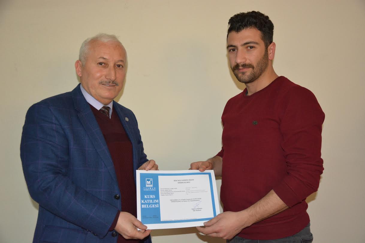 Sertifika töreninde konuşan KSMMMO Başkanı Fikret Gökmen, “216 saatlik eğitiminizi başarıyla tamamladınız. Böylece Mart ayı içerisindeki gerçekleşecek olan sınavlarınıza da hazırlanmış oldunuz. Tüm kurul üyesi arkadaşlarım adına hepinize tek tek başarılar diliyorum. Umarım sınavınızı da başarıyla gerçekleştirirsiniz ve en kısa sürede aramıza katılırsınız. Sınava mümkün olduğunca rahat girmeye çalışın. Bu bir geleceğe hazırlanma eğitimi. Bizim mesleğimiz süreli güncellenen ve yaşam boyu eğitim almamızı gerektiren bir alan. Sizler de ilerleyen zamanlarda da bu eğitimlere katılmaya çalışın mesleki bilgilerinizi hep güncel tutmaya özen gösterin” diyerek stajyerlere önerilerde bulundu.