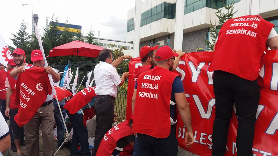 Yönetiminin işçilerin grev hakkına müdahalesini boşa çıkarmamızın ardından bugün (31.07.2017) Tekno Maccafferi işçilei, Birleşik Metal-İş Genel Başkanı Adnan SERDAROĞLU, merkez ve şube yöneticileri ile birlikte; Düzce’deki fabrikanın önünde Grev Pankartı’nı asarak, grevi başlattılar.
