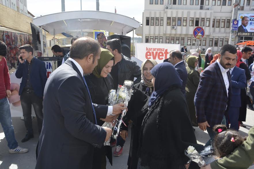 AK Parti Dilovası Kadın Kolları Başkanı Gülay Artut’ta düzenlenen etkinlikle bayanlara çiçek ve “Evet” broşürü takdim ederek bayanlardan 16 Nisan referandumunda destek istedi.