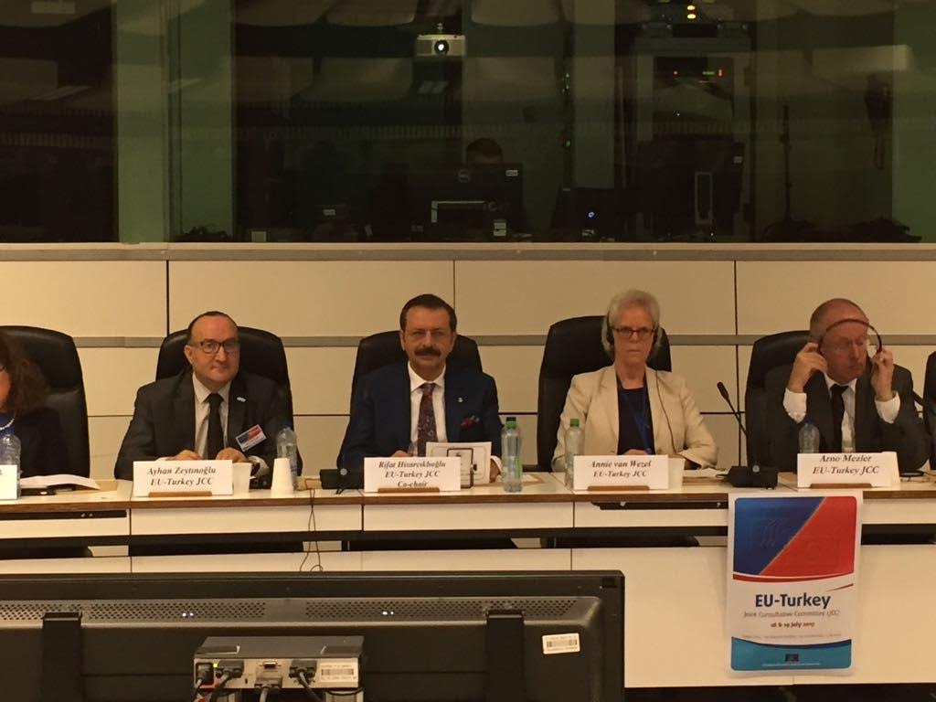 Avrupa Birliği Bakanı Ömer Çelik ve TOBB Başkanı Rıfat Hisarcıklıoğlu ile birlikte AB komisyonundan üst düzey yetkililer, bürokratlar ve sivil toplum kuruluşlarının temsilcilerinin de katıldığı toplantıda, “Türkiye ve AB arasındaki siyasi ve ekonomik ilişkilerin nasıl geliştirilebileceği, Gümrük Birliği ve AB entegrasyonunun ilişkilerin geleceği üzerindeki etkileri” konuları ele alındı. Toplantıda Gümrük Birliğinin Modernizasyonu konusunda bir sunum yapan İKV Başkanı Ayhan Zeytinoğlu, sunumunda Gümrük Birliğindeki sorunlar ve çözüm önerilerine değindi. Türkiye ile AB’nin iki önemli ticari partner olduğunu vurgulayan Ayhan Zeytinoğlu Gümrük Birliği Modernizasyonu sürecine dikkat çekti. Gümrük Birliği modernizasyonu ile ilgili iki önemli konuya değinen Zeytinoğlu, süreçten beklentilerin yanı sıra, sürecin tamamlanması aşamasındaki zorluklardan söz etti.