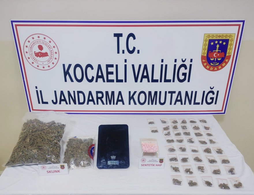 Kocaeli İl Jandarma Komutanlığı ekipleri tarafından İzmit’te düzenlenen uyuşturucu operasyonunda ,900 gram skunk, 99 adet sentetik hap ve 1 adet hassas terazi ele geçirildi. Olayla ilgili 1 kişi gözaltına alındı.