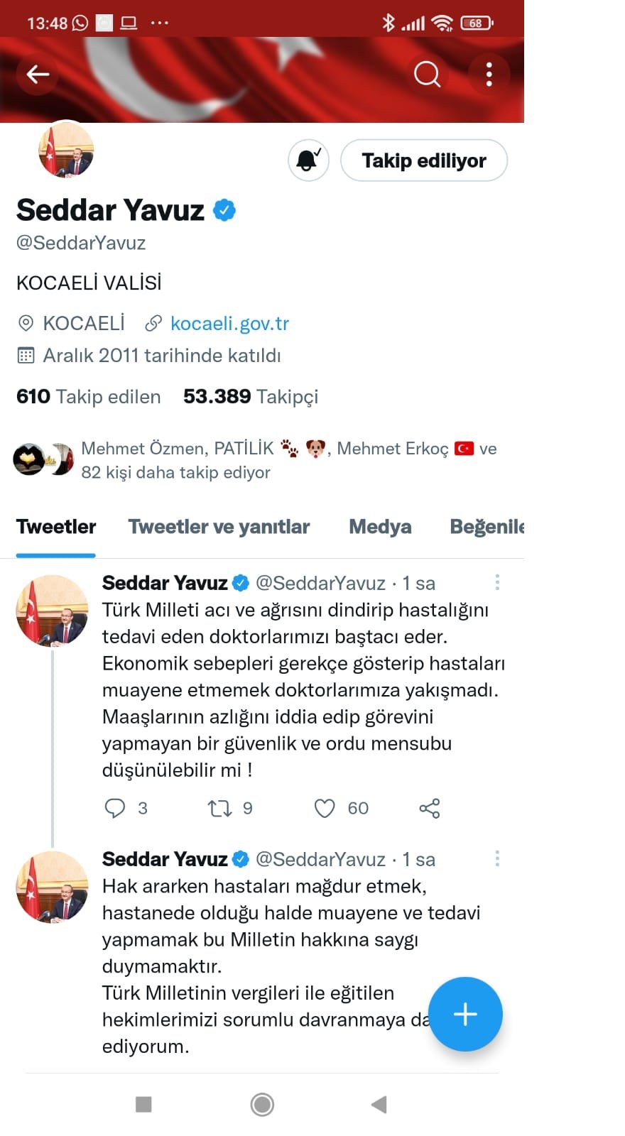 Türkiye genelinde birçok ilde bazı hekimler 3 gün sürecek iş bırakma eylemine başladı. Kocaeli Valisi Seddar Yavuz, iş bırakma eylemi yapan doktorlara sosyal medya hesabından yapmış olduğu paylaşım ile yüklendi. Yavuz, yapmış olduğu paylaşımında şu ifadeleri kullandı. “Türk Milleti acı ve ağrısını dindirip hastalığını tedavi eden doktorlarımızı baştacı eder. Ekonomik sebepleri gerekçe gösterip hastaları muayene etmemek doktorlarımıza yakışmadı. Maaşlarının azlığını iddia edip görevini yapmayan bir güvenlik ve ordu mensubu düşünülebilir mi! Hak ararken hastaları mağdur etmek, hastanede olduğu halde muayene ve tedavi yapmamak bu Milletin hakkına saygı duymamaktır. Türk Milletinin vergileri ile eğitilen hekimlerimizi sorumlu davranmaya davet ediyorum” dedi.