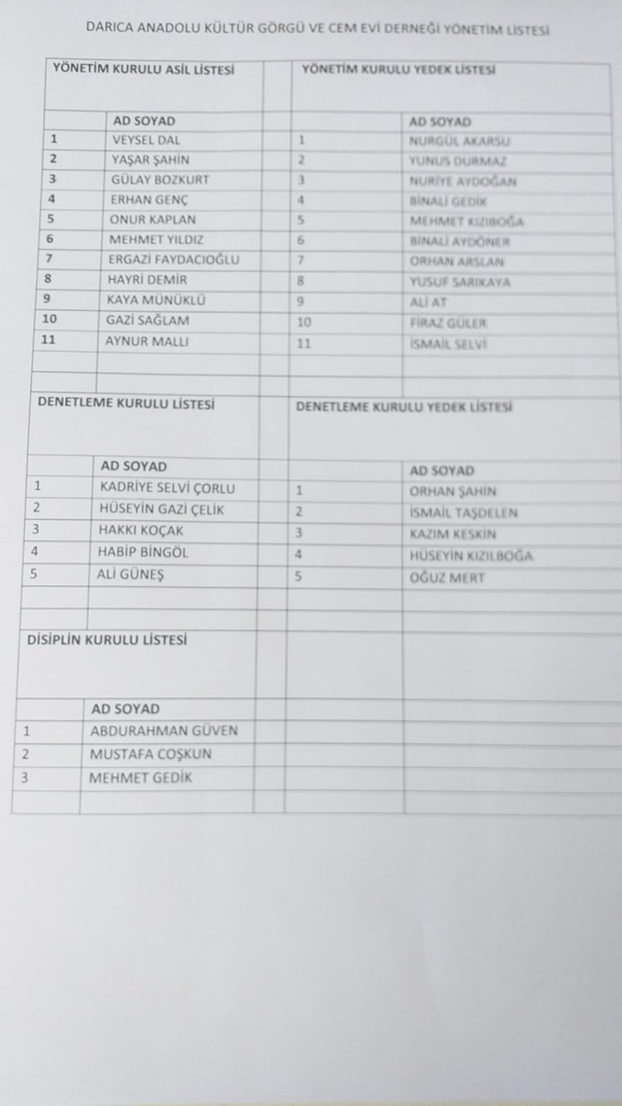 Darıca Anadolu Kültür ve Görgü Derneği Darıca Cemevi’nin 17’nci genel kurulu önceki gün gerçekleştirildi. Gerçekleşen genel kurulda yeni dönem Cemevi Başkanı Veysel Dal seçildi. Bir önceki Cemevi Başkanı Hüseyin Koca ve yönetimine hizmetlerinden dolayı teşekkür edildi. Yeni seçilen yönetim liste ise şu şekilde;